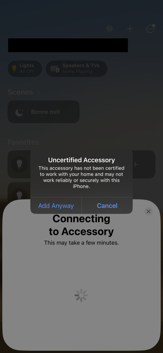 例えばApple HomeKitへの登録の場合、Matterのデバイス認証に失敗した場合、Matter認証済みデバイスではないという警告が表示されるものの、ユーザーの判断でそのままデバイスを登録することができます。