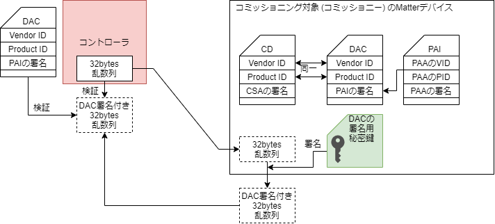 また、デバイスがDACの秘密鍵を持っていることを検証するため、コミッショナーは32バイトの乱数列を生成し、 AttestationRequestコマンド としてデバイスに送付します。 デバイスはDACの秘密鍵を使って送られてきた32バイトの乱数列に署名を行い、 AttestationResponse としてコミッショナーに送り返します。あとはコミッショナーがAttestationResponseに入っている署名内容を検証すれば、デバイスが正当なDACを持っていることが検証できます。