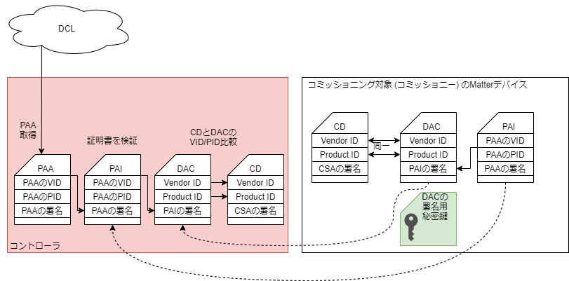 Matterデバイスは、デバイス固有のDACの証明書と署名用の秘密鍵、およびDACに紐づくPAIの証明書を持っています。 コミッショナーはDACの検証のために、DACとPAIの証明書をデバイスから読み出して証明書チェーンを検証します。