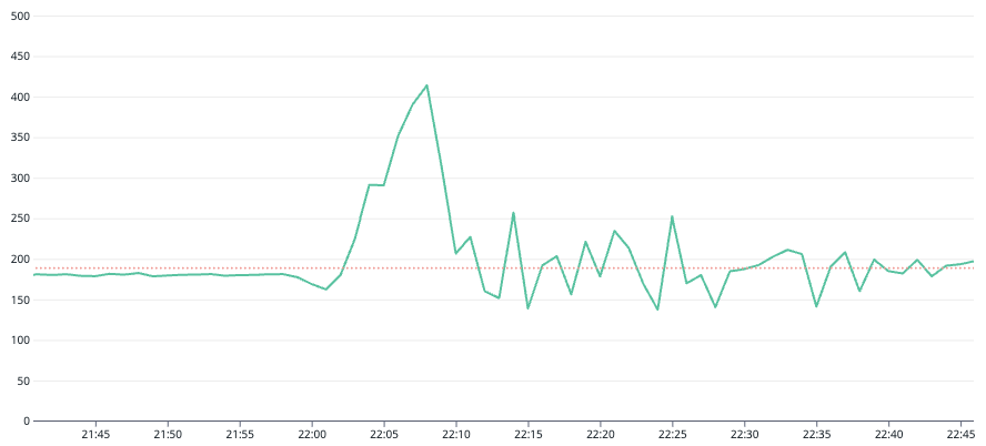 通常時の消費キャパシティユニットは190wcuあたりで安定しているのですが、22時を過ぎたあたりからグラフに大きな変化があるのがわかると思います。 ThrottledRequestsは、書き込み負荷が増加し始めてから数分で150k(throttling/min)に到達しました。このときのConsumedWriteCapacityUnitsは160(wcu/sec)でした。150000(throttling/min) = 2500(throttling/sec)なので、