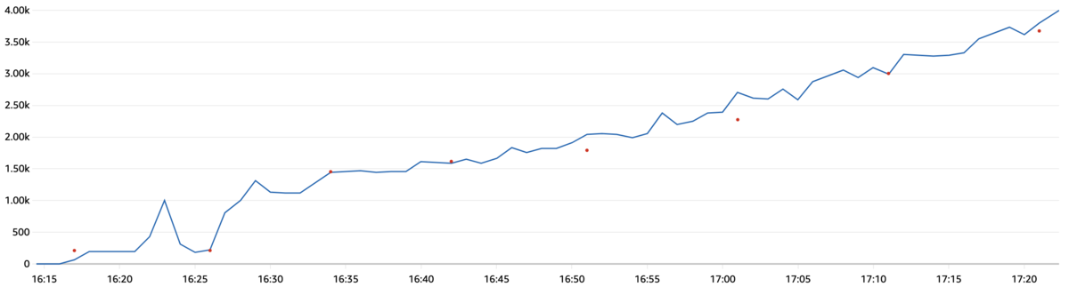 検証を簡単にするため、190wcuを消費していたところ、いきなり瞬間最大風速値である3800(req/sec)の負荷がかかり始めるという状況を想定してみます。15分以内に3800wcuを消費できるまでスケールアウトをすることが確認できれば今後同じような障害が起こっても問題ないでしょう。