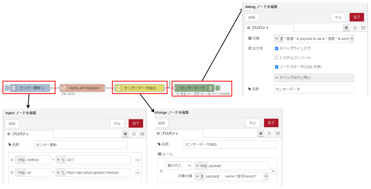 センサー更新 injectノードは今まで通り、 GET https://api.nature.global/1/devices にアクセスする設定です。