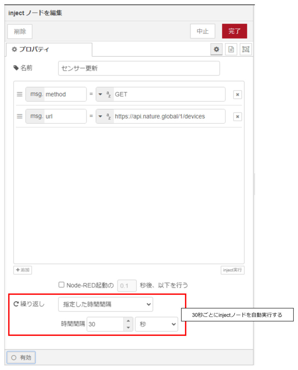 動作を確認したら、 センサーを更新injectノードの設定を変更して、30秒ごとに自動実行するようにします。これで30秒ごとに自動的にセンサー情報を取得して、人感センサの反応時刻に応じて照明を点灯・消灯できるようになりました。