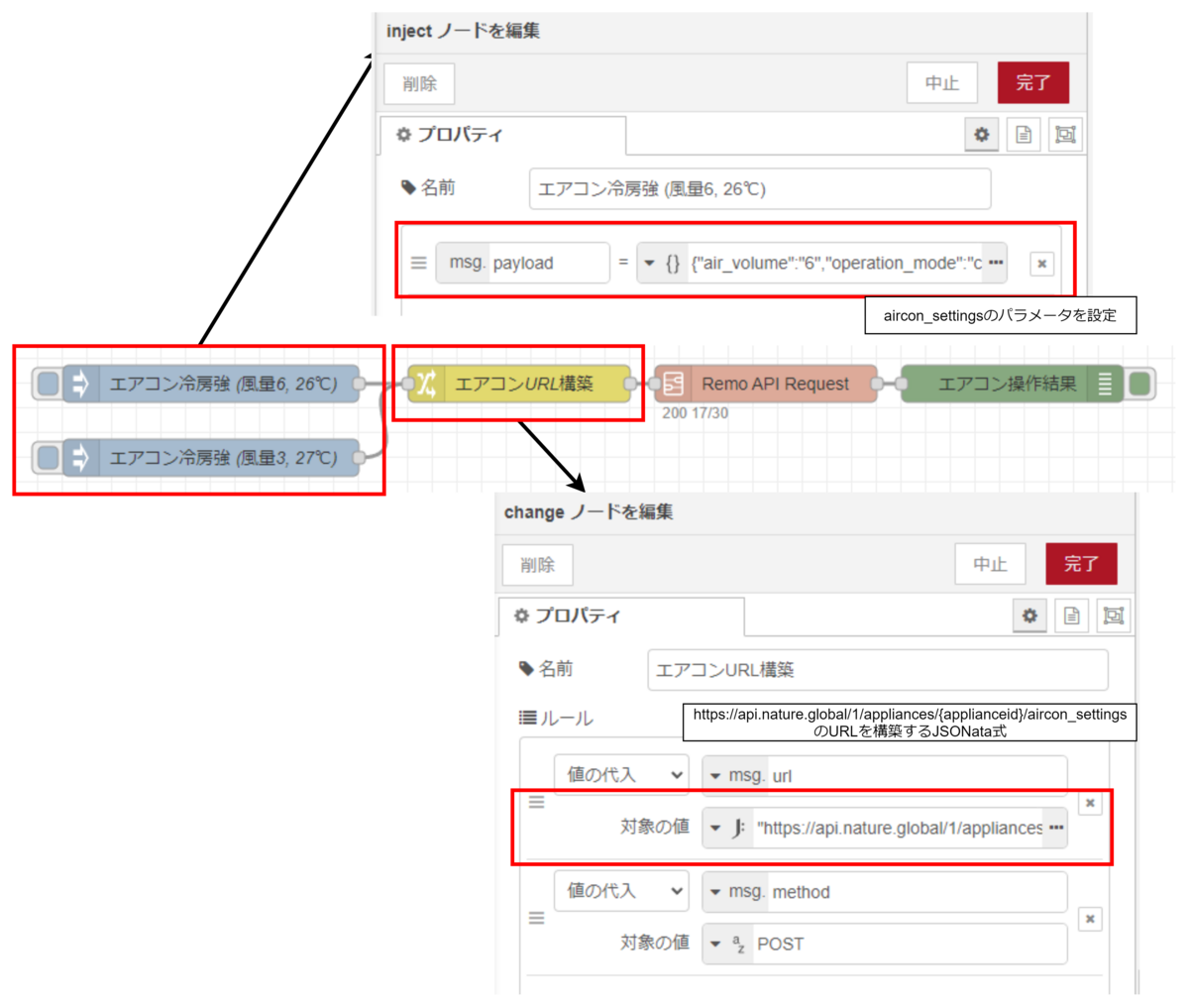 また、URL構築用のchangeノードで、以下のJSONata式を使ってURLを構築します。