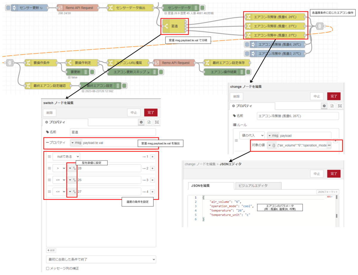 ここまででエアコンの設定をNode-RED上から手動で変更できるようになりました。 最後に、エアコンの設定をRemo3/mini2の温度センサに基いて制御してみましょう。