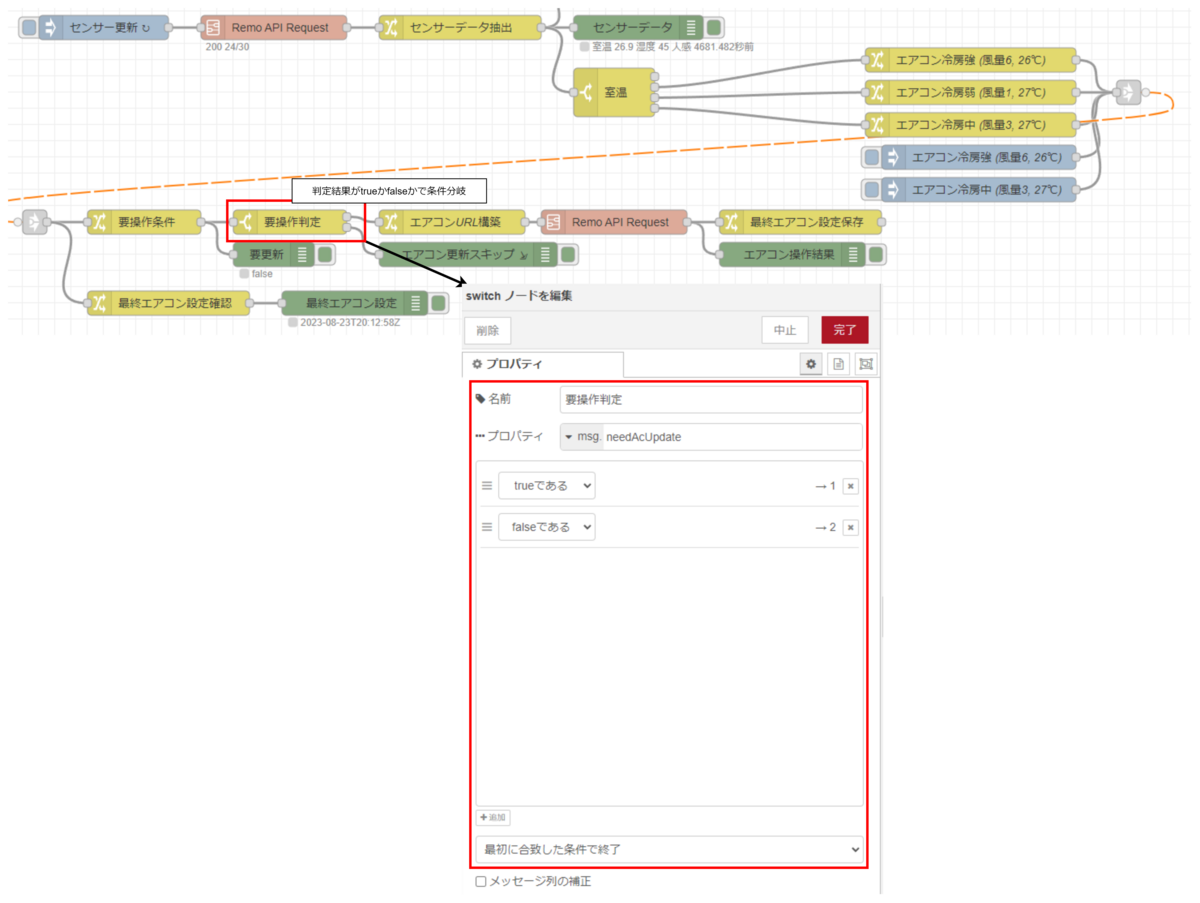 判定結果は msg.payload ではなく、 msg.needAcUpdate に設定しておきます。 msg.payload には設定したいエアコンのパラメータが入っており、リクエスト送信ノードにそのまま伝搬する必要があるためです。